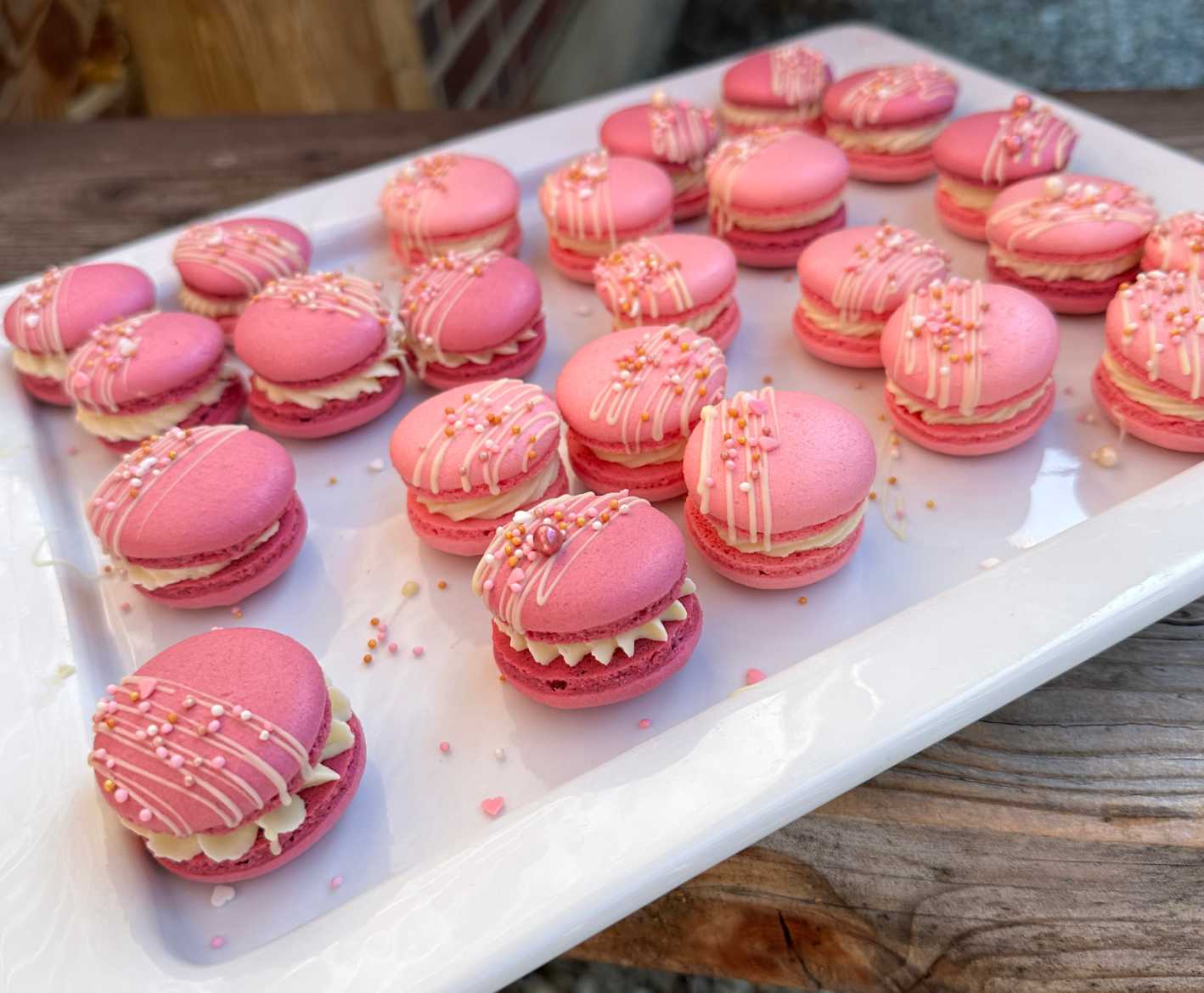 Nach einigen Fortbildungen weiß sie haargenau, worauf es ankommt und zeigt ihren KursteilnehmerInnen, wie sie aus Biscuit, Swiss Meringue Buttercreme und unterschiedlichen Schablonen wunderschöne Torten kreieren können. Und weil Macarons als i-Tüpfelchen bei der Dekoration nicht fehlen dürfen, zeigt Simone obendrein, wie das beim Backen so empfindliche Gebäck gelingt.