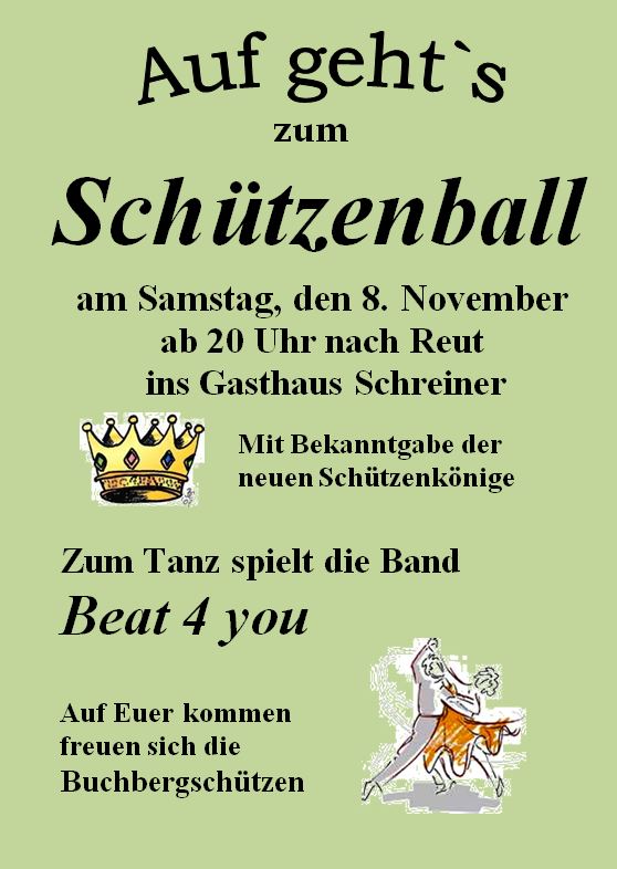 Der traditionelle Schützenball der Buchbergschützen findet am Samstag, den 08.11.2025, ab 20 Uhr im Gasthaus Schreiner mit Bekanntgabe der neuen Schützenkönige statt. Zum Tanz spielt die Band „Beat 4 you“.