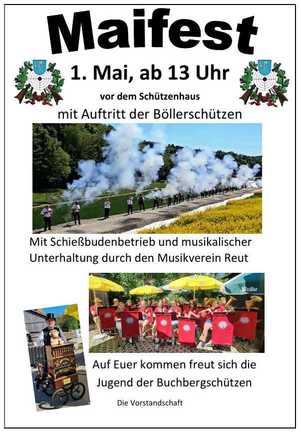 Am 1. Mai 2026, ab 13 Uhr; fiindet wieder das traditionelle Maifest der Buchbergschützen vor dem Schützenhaus statt. Es treten die Böllerschützen auf. Für die musikalische Unterhaltung sorgt der Musikverein Reut. Für das leibliche Wohl sorgen die Jungschützen.
