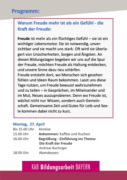 Schriftlich beim KAB-Bildungswerk in der Diözese Passau e. V., Kapellplatz 8, 84503 Altötting, per Mail kab.aoe@bistum- passau.de oder online über www.bildungswerk.kab-passau.de. >>>Wir bestätigen Ihnen die Anmeldung. Bitte erst nach Zahlungs- aufforderung die Teilnehmergebühr auf das Konto KAB-Bildungswerk Passau e. V. überweisen.
